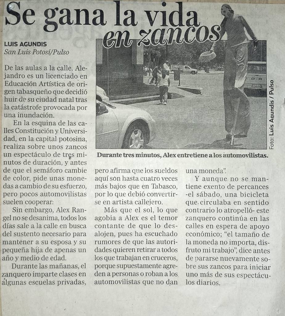 En Tabasco, conoció a dos personas muy importantes: Jaime Arce y “Chucho”. Junto a ellos dos comenzó a aprender a zanquear, cosa que al principio se le dificultaba mucho, pero nunca perdió el interés de dejar de practicar. Cuando podía, Alexi se subía a los zancos en su casa, y recargaba sus manos en el techo para evitar caerse, después de mucha perseverancia, estuvo listo para comenzar a ir a trabajar. En sus primeros eventos tuvo tropiezos, como cuando se puso los zancos al revés y se cayó, pero no se desanimaba… él mismo se reía de sus errores.